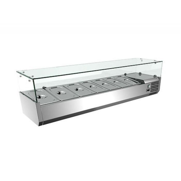 You are purchasing a brand new, top of the range, heavy duty, 1600mm Long x 400mm Wide x 450mm High, bench-top type saladette, this salad fridge is constructed of the best food grade stainless steel #304, has glass cover and an Italian "Dixell" brand digital temperature control. Temperature range is 2 to 8 degrees and has automatic defrosting. This unit comes with 7pcs 1/3GN food grade stainless steel containers and there lids (7 x 1/3GN) (325mm x 176mm). Containers are 100mm deep, you can upgrade to a 150mm depth: