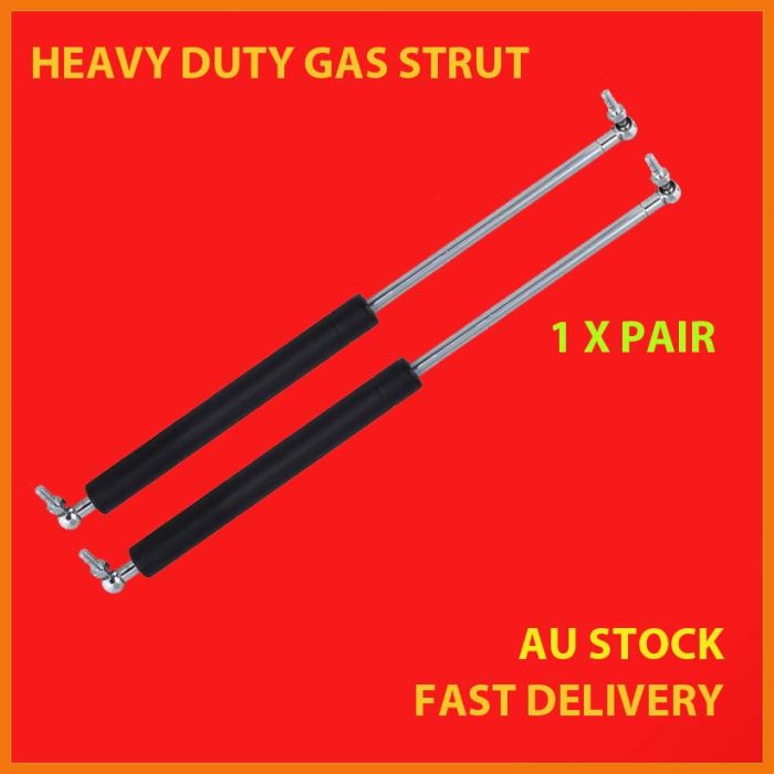 You are purchasing a brand new, heavy duty, 1 x pair of gas struts. Designed for assisted lifting and provides controlled movement for a range of automotive and industrial purposes. The most common use is to provide control over the opening movement of heavy and potentially dangerous equipment from falling on your head such as bonnets, boots, canopies, flexiglass, doors, toolboxes, caravans etc. These gas struts are recommended for use with items around 5kg or 10kg. For example, if your car boot/bonnet is around 5Kg use 1 strut ONLY. If it weighs around 10kg use both struts (one on each side).