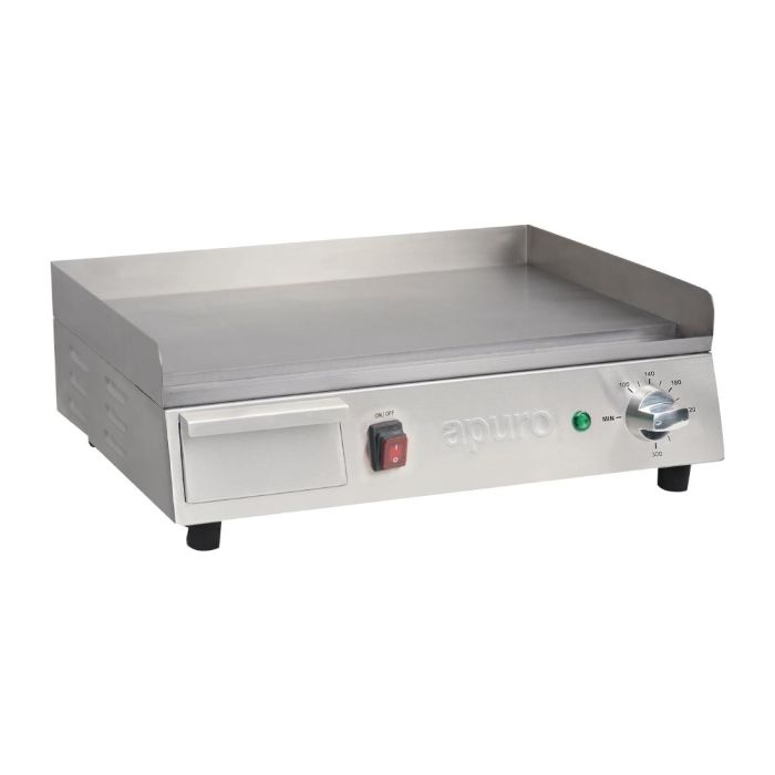 This compact griddle from Apuro may be small, but it always delivers a big performance. The 520 x 330mm cooking surface is heated by a powerful 2.2kW element that guarantees fast heat-up times and an even distribution of heat across the steel plate.