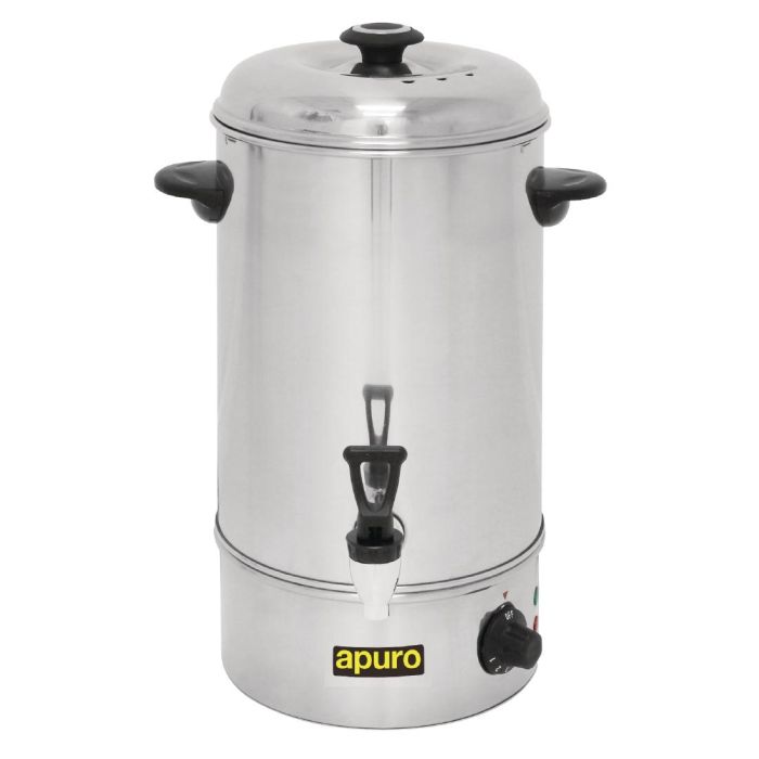 The Apuro 10ltr manual fill hot water urn is a powerful and versatile addition to commercial premises. Ideal for mobile caterers, B&Bs and staff rooms, the kettle is perfect for buffet-style breakfast service and businesses with limited access to mains water. The easy to clean, fully-welded stainless steel construction ensures that the urn is strong, water-tight and durable. With a powerful 2200W concealed element and variable temperature control, the Apuro commercial boiler can be used to keep water below boiling if necessary. Supplied with sturdy handles to ensure the unit is portable and a non-drip tap which is robust and secure, the boiler is a valuable addition to any commercial catering establishment.