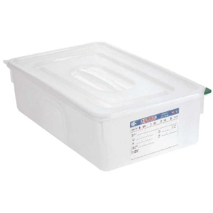 Colour coded airtight containers with lid.Sets of colour clips included (red, yellow, green & blue).Available in Gastronorm sizes.Temperature range -40?C to 95?C. Permanent wipe clean label fixed to each container, dishwasher proof.