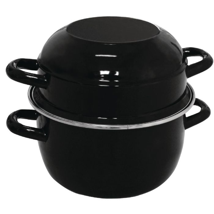 A black pot with handles and a stainless steel rim for stove to table use, perfect for serving medium sized portions of steaming hot mussels to the table, the lid can also be used for the disposal of shells.