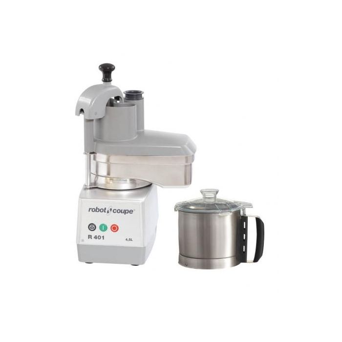 R 401 Food Processor: Cutter/Vegetable Slicer equipped with a cutter attachment for chopping, fine mincing, emulsions, grinding and kneading, and a Vegetable preparation attachment for slicing, grating, ripple cut slicing, and julienne.
