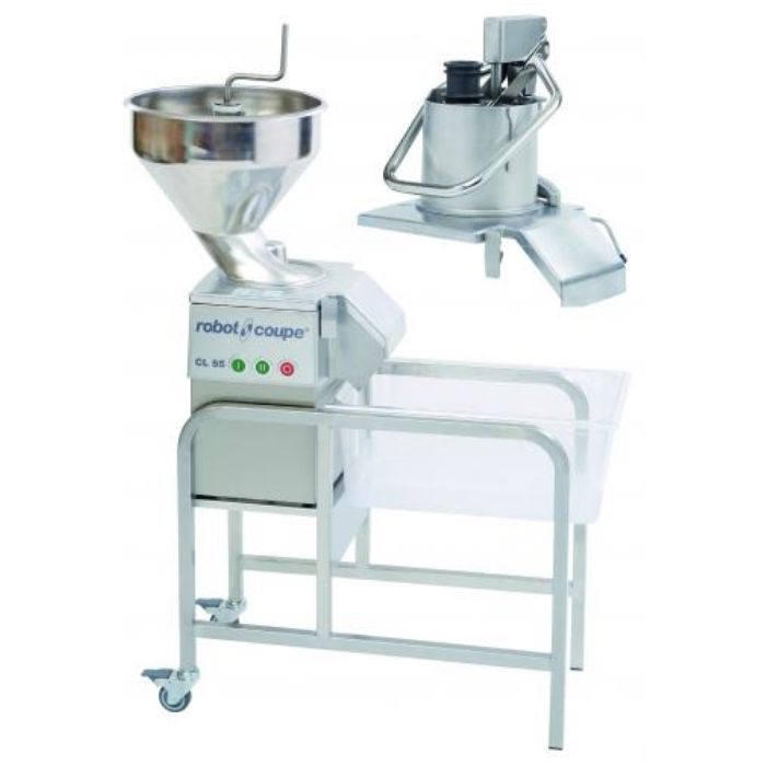 CL 55 2 Feed Heads – Single phase. Power - 1100 Watts. 1 speed 375 rpm or 2 Speeds 375 and 750 rpm. Magnetic safety system, motor brake and lever-activated auto restart. This metal Vegetable Preparation Machine has a lateral ejection facility and is equipped with 2 Feed Heads: 1 Automatic Feed Head and 1 Pusher Feed Head with XL full moon hopper, diameter: 238 cm2; loading volume - 4.2 litres, and integrated cylindrical hopper Ø 58 mm. Stainless steel motor base, bowl, lid and trolley. Suitable for 100 to 1000 covers per service. No discs included. Large choice of 50 discs in option.