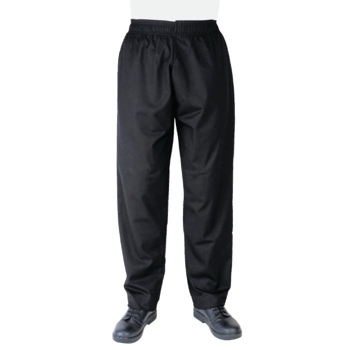 Simple, stylish and durable unisex Vegas chefs pants (S) with an extra wide waistband for a more comfortable fit. Easy laundering with no buttons to break, these chef pants are ideal workwear for a busy kitchen.