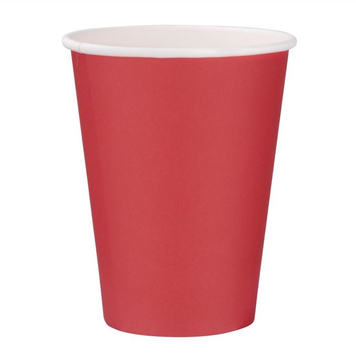 This pack of 1,000 bright red disposable coffee cups from Fiesta will add a touch of colour to your takeaway drinks service. Attractive and practical, each 340ml (12oz) cup features a strong rolled rim that provides a tight and secure grip for lids - perfect for preventing accidental spills and burns. When paired up with a cardboard sleeve, these disposable cups are even more comfortable to grip when holding hot drinks.