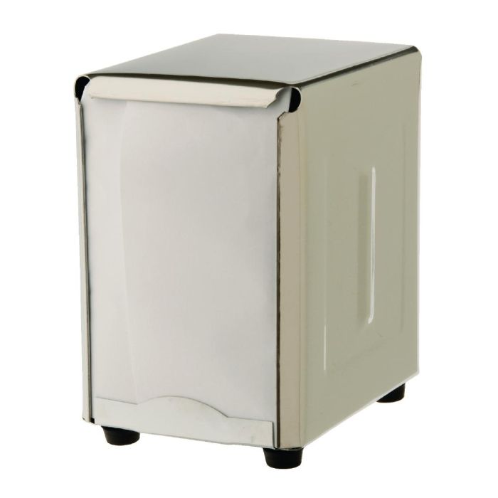 Classic 50's chrome-look stainless steel dispenser. Double sided load. 140(H) x 95(W) mm. Recycled single ply napkins for dispenser (GG358) sold separately.