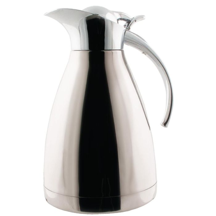 Attractive stainless steel vacuum jug with sealed hinged lid and double wall stainless steel body for improved heat retention.