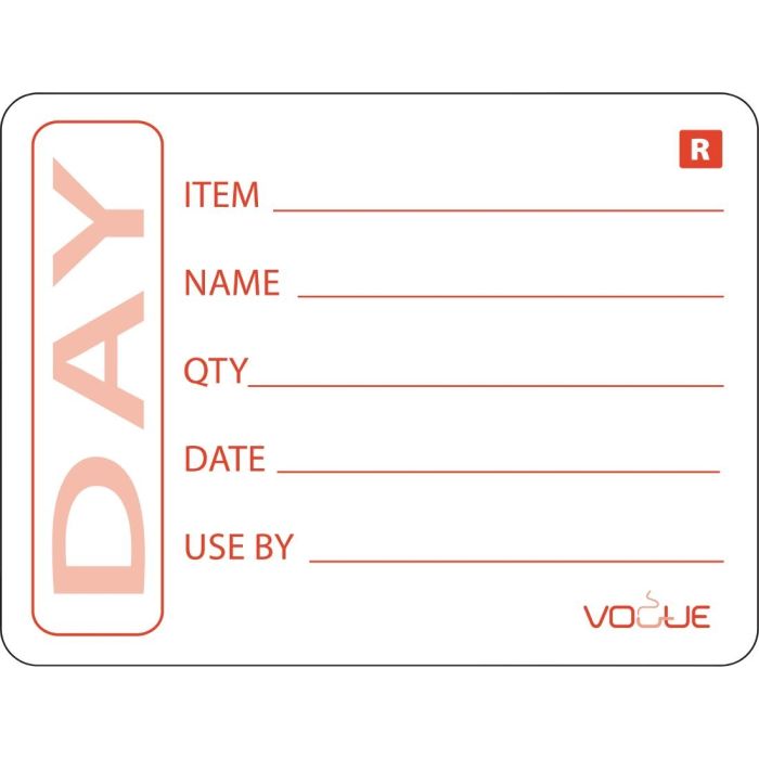 The day labels from Vogue feature an adhesive that has a strong hold yet leaves nothing behind when removed, meaning no more adhesive residues left on your containers. With space provided to include the name of the individual who prepared the product, these labels give full traceability, and can provide an ideal solution to stock rotation by identifying when the product was prepared and when it must be used by. This allows easy FIFO rotation, reducing waste. There is also space to include the product name and quantity of items, allowing easy identification of contents.