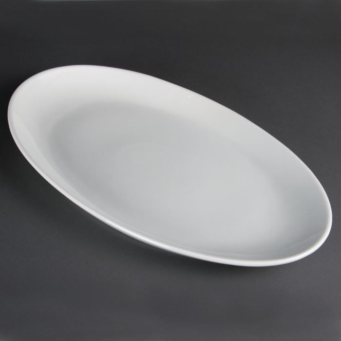 Great value, great performance - this large oval plate from Olympia is perfect for busy restaurants who want simplicity and reliability. The pure white porcelain design blends in with any setting, and the 500mm plate is fully vitrified to give it the strength and durability to cope with repeated everyday use. Featuring rolled edges for increased chip-resistance, it can be used for reheating tasks in the oven or microwave, and can be cleaned in the dishwasher too.