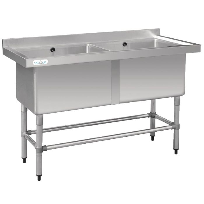 Vogue deep bowl sink for washing large pots, pans and containers etc easily. Raised lip channels spills and splashes back into the sink, minimising over-spill and raised rear upstand prevents items from falling behind the sink during use. Adjustable legs allow for stable positioning on almost any floor surface. Supplied with waste and wall fixings for increased stability. Stainless steel construction. 2 x 400mm deep bowls (2 x 100 litres). Complete with waste and wall fixings.