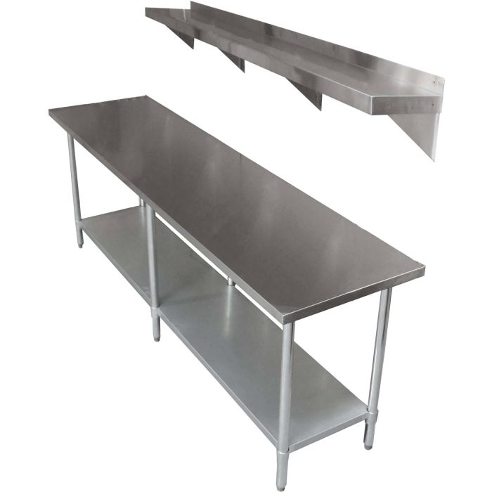 You are purchasing a brand new, top of the range, heavy duty, all stainless steel work bench and stainless steel wall mounted shelf. It is simply the best available for all the features it's packed with. This table unlike most others being sold comes with 16 screws, each leg is screwed on the upper and lower shelf by two screws. This ensures your table is stable, sturdy, balanced and safe. This shelf is as stable & sturdy as they get. Heavy duty construction. This shelf has four support brackets which makes it very stable & gives extra lifting capacity. Shelf is very well made and comes with all accessories needed to mount this shelf such as screws, chewies etc. Shelf can be placed above bench for extra storage or to hold all necessary equipment such as pots and pans etc. More sizes & models available in stock.