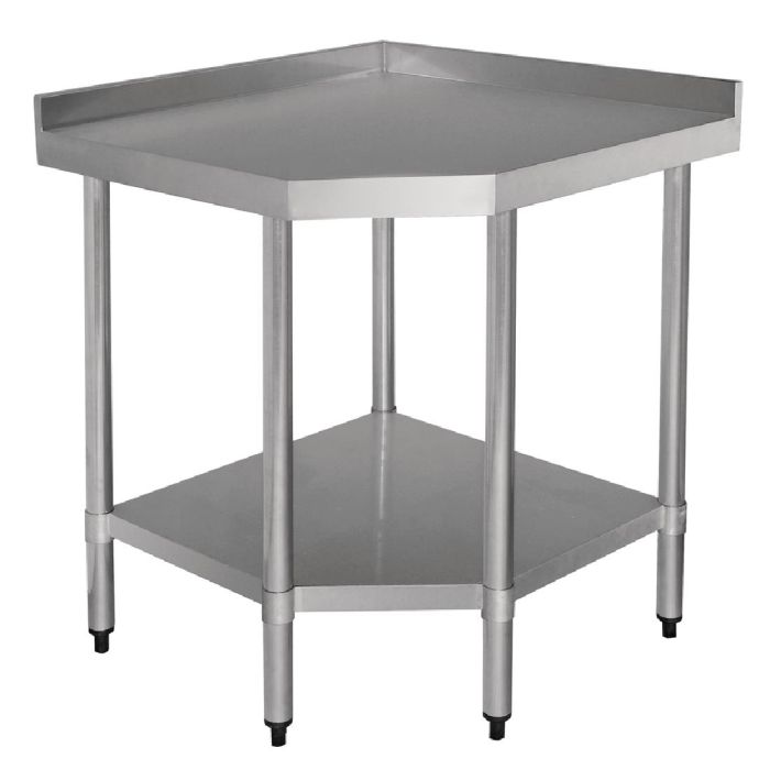 Don't leave any kitchen space unused! This corner prep table from Vogue will make the most of your tight spaces, offering a generous 0.63m² surface area for meal prep or additional storage. The rear upstand protects your walls behind from splashes or stains, and will also stop any small utensils or other items from falling down the back. Below, a strong and sturdy undershelf provides yet another storage option - perfect for holding containers, utensils or small appliances.